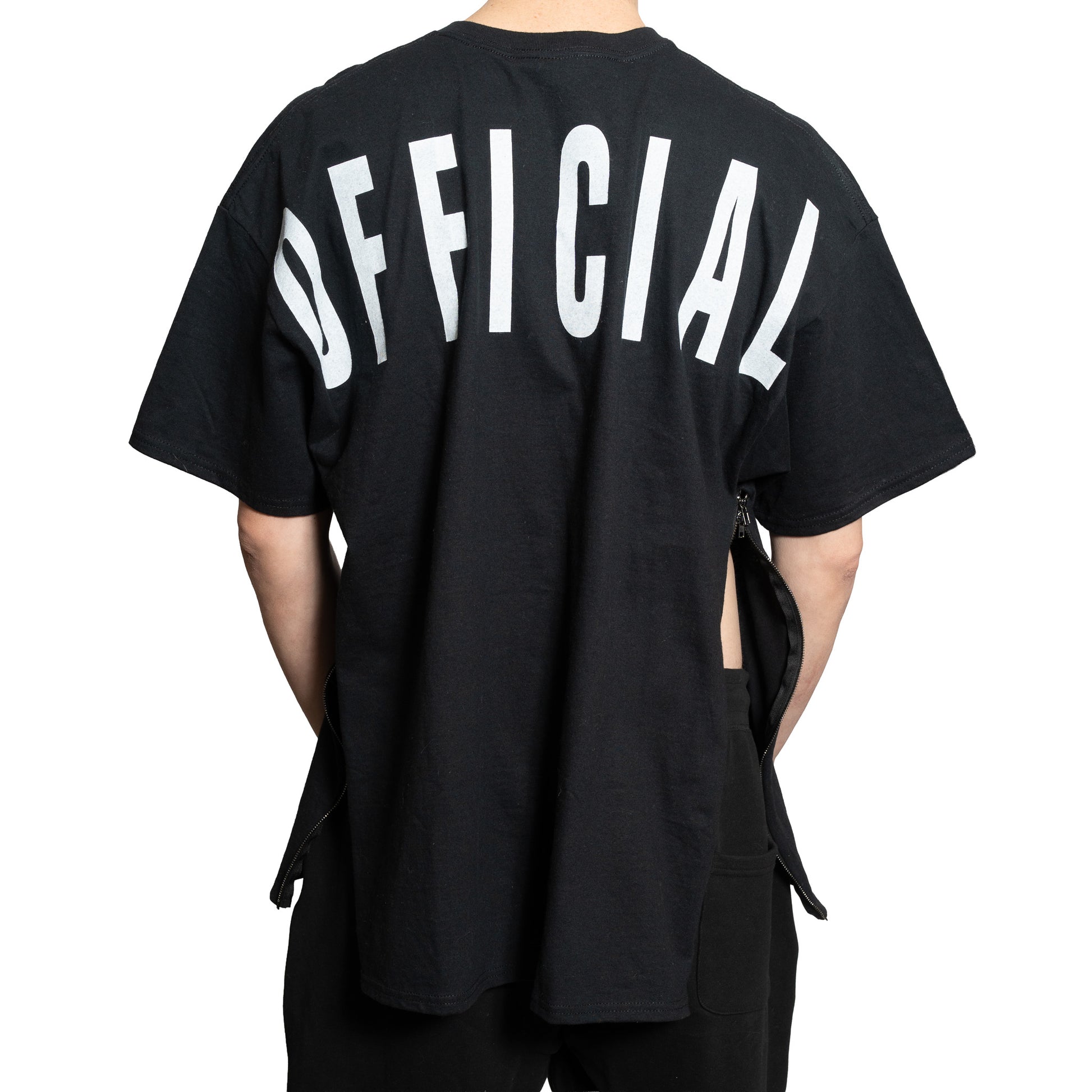 100% cotton t-shirt with oversized “OFFICIAL” print over back shoulders. Two way metal zippers on both side seams, from under arm to hem, for an adjustable fit. Size 2XL pictured.